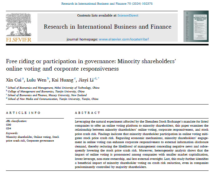 英国上市365官网崔欣博士(第一作者)撰写发表了有关中小股东积极主义对管理层行为及公司治理影响的文章。文章名为“Free riding or participation in governance: Minority shareholders’ online voting and corporate responsiveness”,刊发于Research in International Business and Finance。该期刊是SSCI一区期刊,ABS2级期刊,影响因子6.5,在JCR学科类别Business & Finance的111种期刊中排名第9。