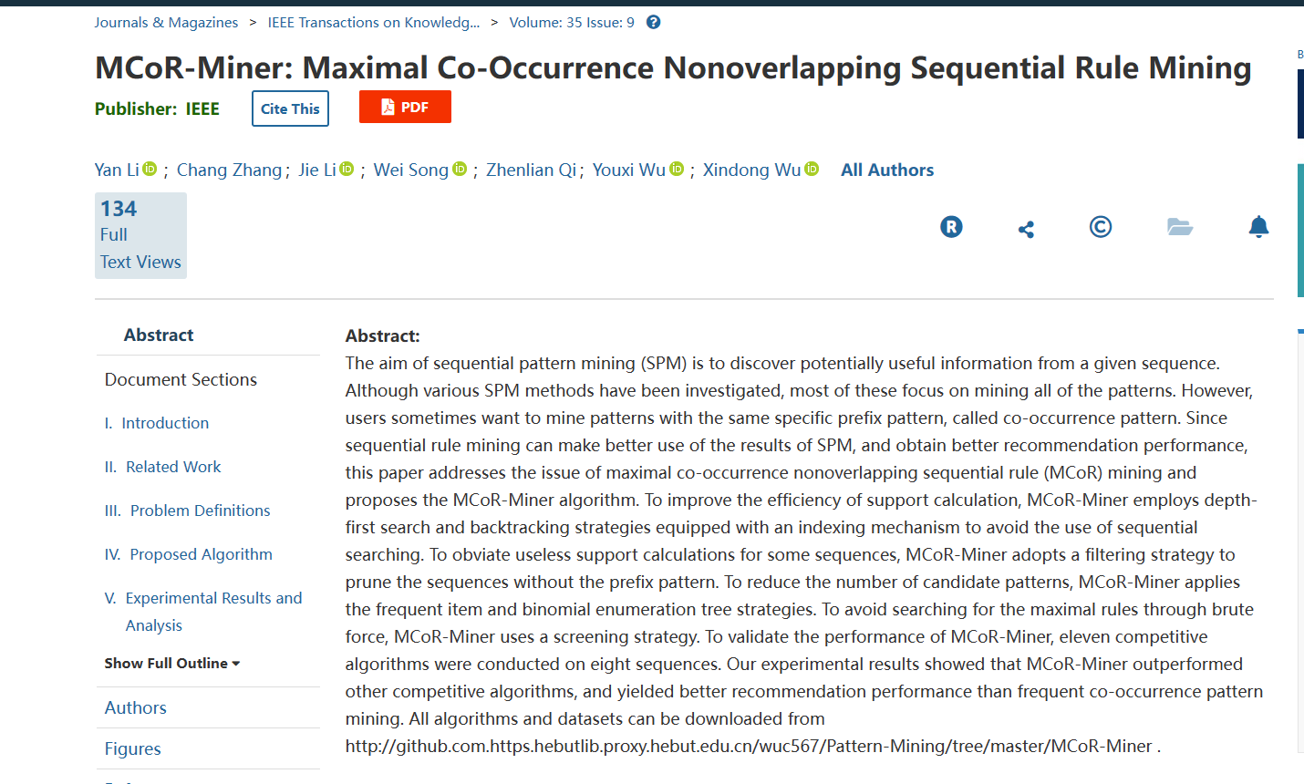 英国上市365官网李艳副教授(第一作者)撰写发表了关于挖掘最大共生无重叠序列规则的文章。文章提出了最大共生无重叠序列规则挖掘算法MCoR-Miner。该算法具有良好的推荐效果。文章名为“MCoR-Miner: Maximal Co-Occurrence Nonoverlapping Sequential Rule Mining”,刊发在IEEE Transactions on Knowledge and Data Engineering。该期刊是数据挖掘领域知名的国际顶级期刊,SCI一区期刊,影响因子8.9。