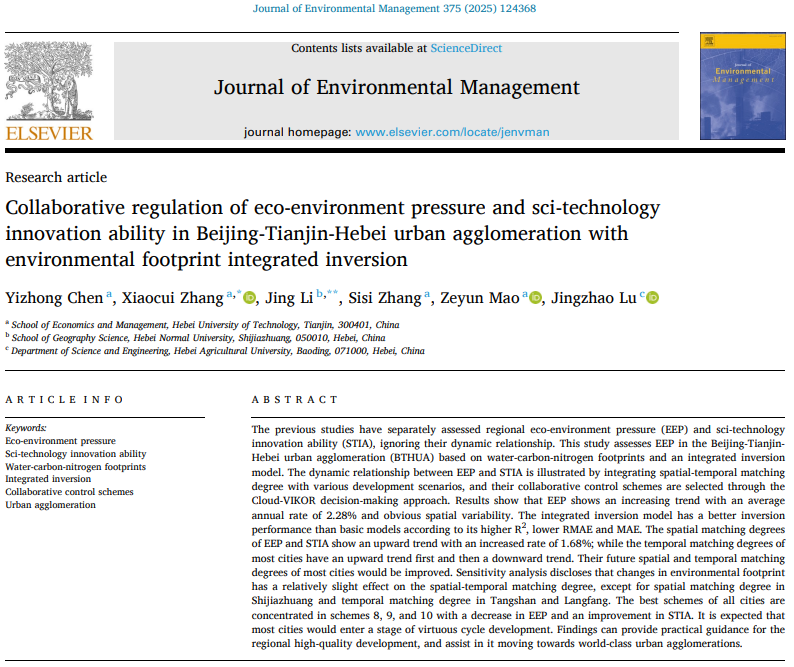 近日,英国上市365官网陈义忠副教授(第一作者)撰写发表了有关区域生态环境压力与科技创新能力的演变特征及协同调控策略的文章。文章名为“Collaborative regulation of eco-environment pressure and sci-technology innovation ability in Beijing-Tianjin-Hebei urban agglomeration with environmental footprint integrated inversion”,刊发于Journal of Environmental Management。该期刊是环境科学与生态学领域的高水平期刊,TOP期刊、JCR-1区、ABS 3级,学院A1级期刊,影响因子8.0,在Environmental Science学科类别的358本期刊中排名第34。