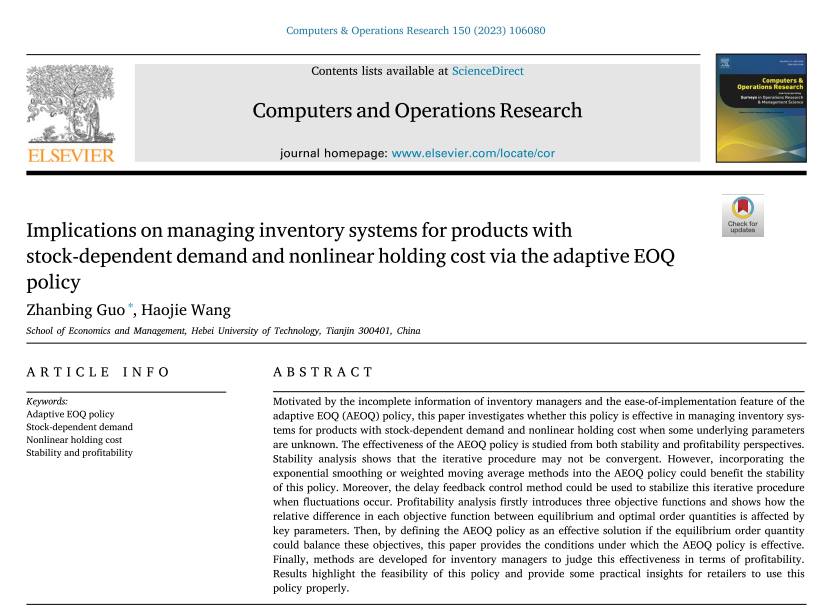 英国上市365官网郭战兵博士(第一作者和通讯作者)撰写发表了关于库存管理策略的文章。文章名为“Implications on managing inventory systems for products with stock-dependent demand and nonlinear holding cost via the adaptive EOQ policy”,刊发在Computers & Operations Research。该期刊是运筹学与管理科学二区期刊,影响因子4.6。