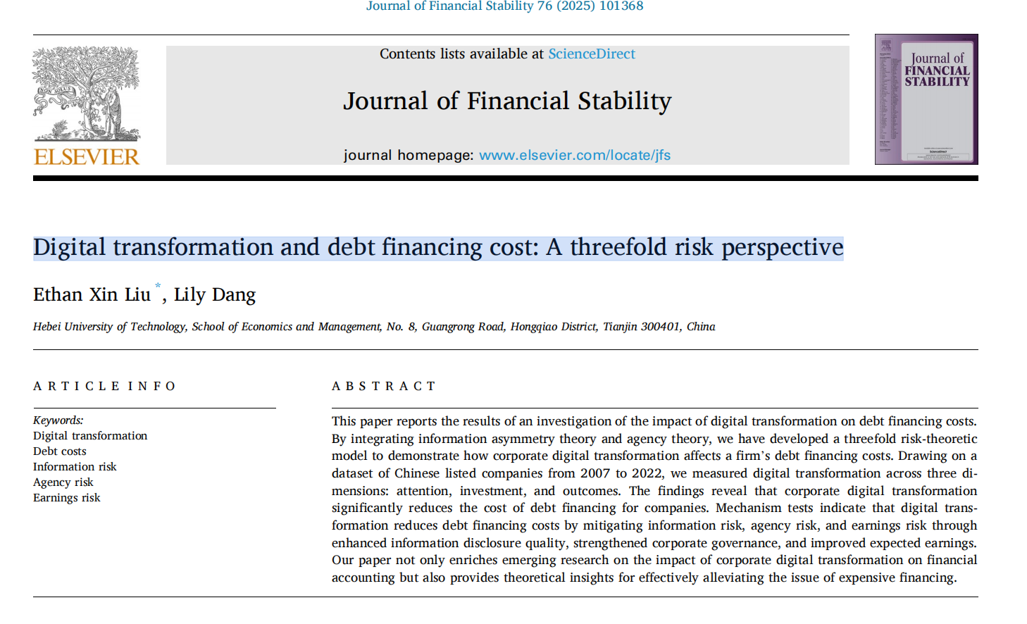 近日,英国上市365官网刘鑫教授(第一作者、通讯作者)撰写的论文《Digital Transformation and Debt Financing Cost: A Threefold Risk Perspective》在Journal of Financial Stability上发表。该期刊是SSCI一区期刊,ABS3级期刊和FMS-B类期刊,2023年影响因子6.1,具有较高的学术影响力。