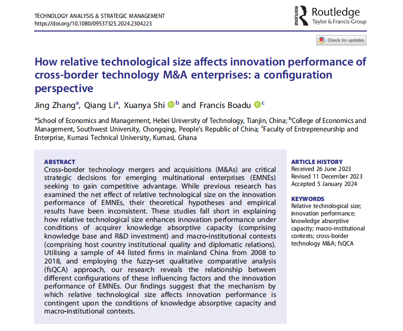 英国上市365官网张敬教授撰写并发表了关于相对技术规模如何影响跨境技术并购企业的创新绩效的研究。文章名为“How relative technological size affects innovation performance of cross-border technology M&A enterprises:a configuration perspective”,刊发在《Technology Analysis & Strategic Management》。该期刊是SSCI,JCR二区期刊,ABS 2级期刊,影响因子2.9。