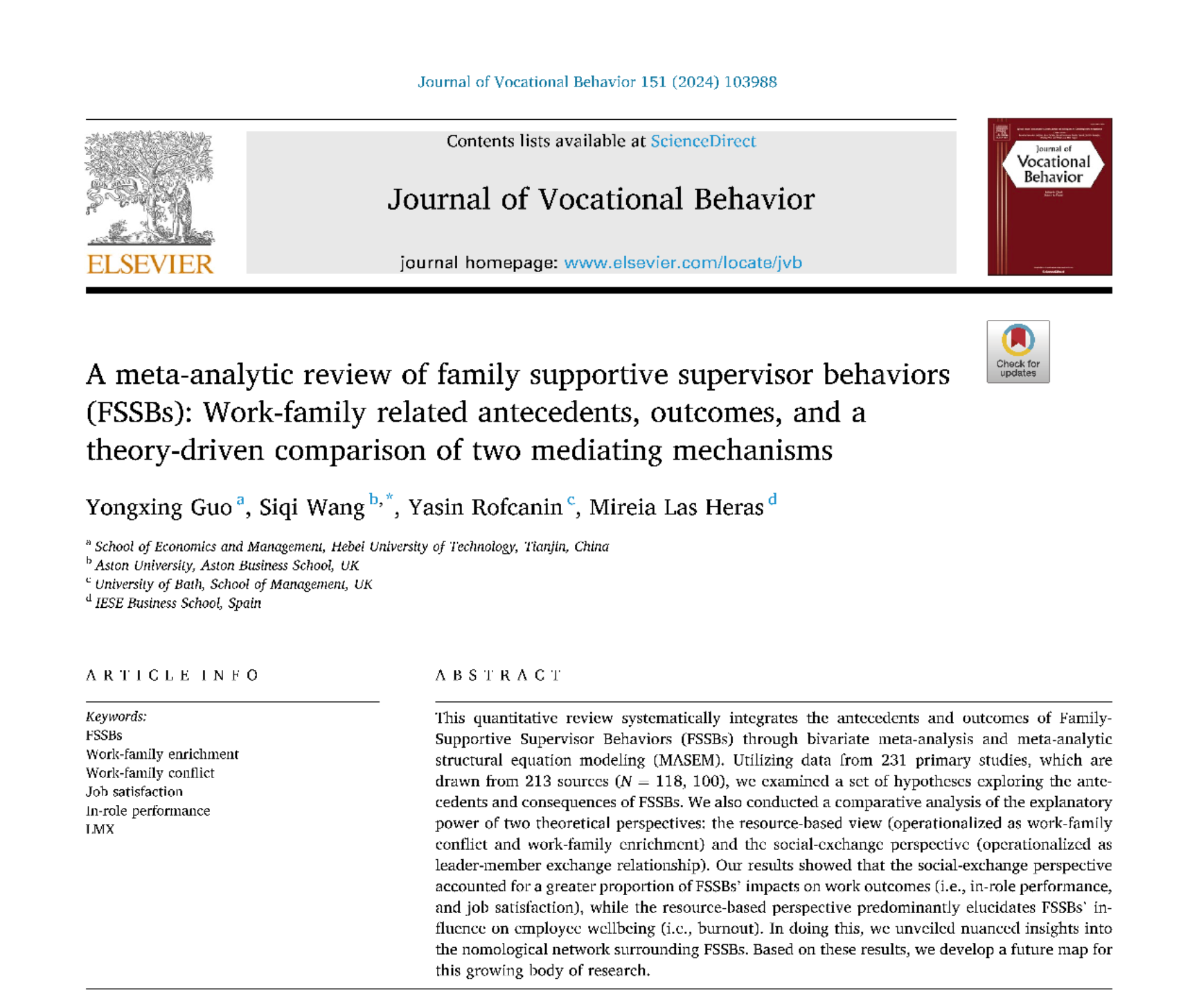 英国上市365官网郭永星副教授(第一作者)撰写发表了关于家庭支持型领导行为影响机制研究的文章。文章名为“A meta-analytic review of family supportive supervisor behaviors (FSSBs): Work-family related antecedents, outcomes, and a theory-driven comparison of two mediating mechanisms”,刊发在Journal of Vocational Behavior。该期刊是SSCI,JCR一区期刊,ABS4级期刊,影响因子11.1。