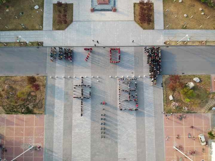 广场上,数百名经管学子排成“中国”字样,靠近国旗一侧的同学身穿红色衣装拼出 “70”字样,分列旗杆两侧,共同构成“70中国”图案,整体造型舒展大气,透露出经管学子们的朝气与力量。