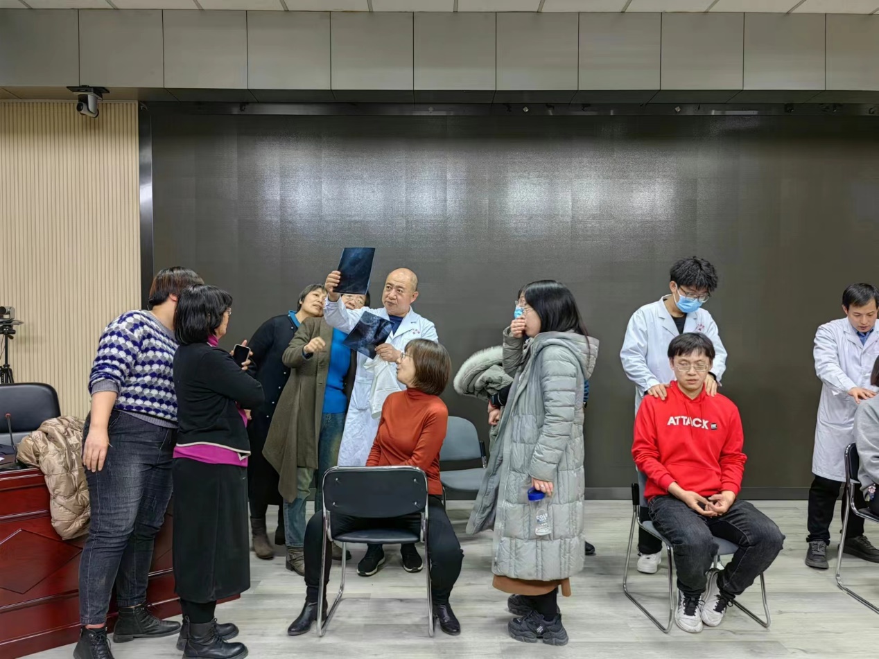 讲座结束后,专家团队为现场师生进行义诊,通过脊诊整脊、针刀、针灸等方式,为头、颈、肩等有不适的师生进行诊察和现场治疗,并提出保健建议。