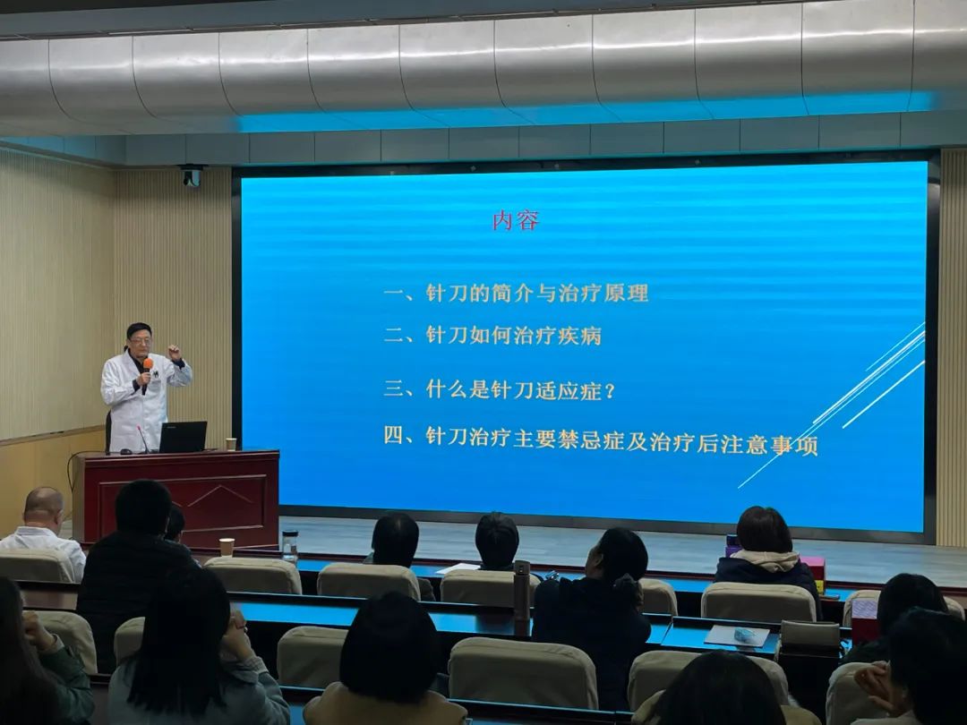 随后,针刀医学传承人、北门医院副院长刘景岩主任向老师们科普了小针刀疗法的原理和应用。刘景岩介绍,针刀是一种结合了中医针灸和现代医学手术刀特点的微创治疗方法,通过刺激人体穴位和经络,达到疏通气血、调和阴阳、治疗疾病的目的。